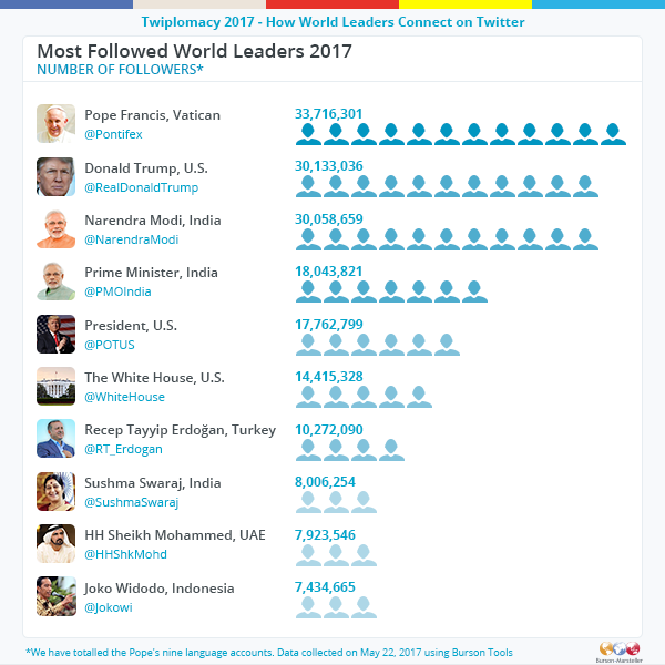 博雅公關的年度“推特外交”研究顯示,教皇方濟各是推特上最多人關注的世界領袖,粉絲數(shù)超3371萬,領先于美國總統(tǒng)特朗普的3013萬。排在第三位的是印度總理莫迪,粉絲數(shù)為3005萬。全球178個國家的276位政府首腦、外長都在使用推特,超過Facebook,后者僅有169位政府首腦在其網站上開設了專頁。但是,關注領導人Facebook專頁的粉絲數(shù)量平均是Twitter的兩倍。特朗普是少有的自己打理推特賬號的領導人之一,過去12個月,他的推特共產生1.66億次互動,約是印度總理莫迪的5倍。特朗普也是推特是被提及次數(shù)最多的領導人。(美通社,2017年5月31日紐約)